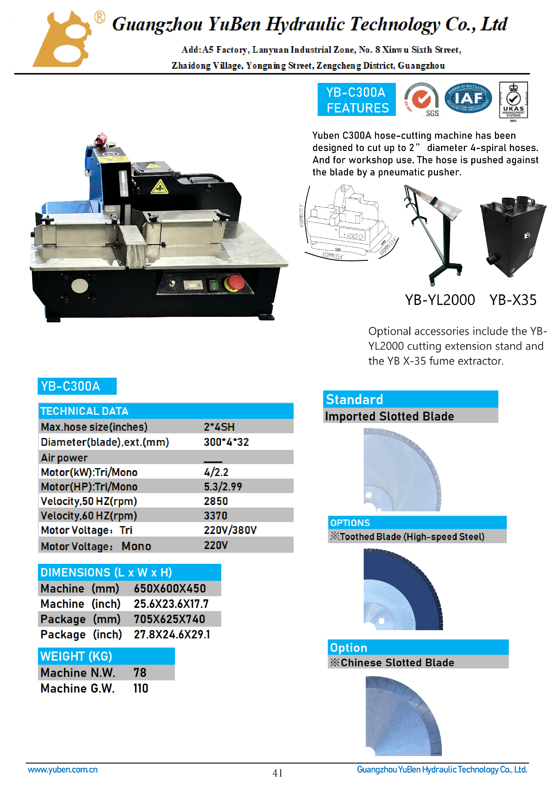 Yuben C300A hose-cutting machine has been designed to cut up to 2” diameter 4-spiral hoses.And for workshop use. The hose is pushed against the blade by a pneumatic pusher.